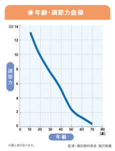 眼には「調節力」という見たいものにピントを合わせる力がありますが、下図のようにピントが合う距離が加齢によって長くなるのが一般的です。